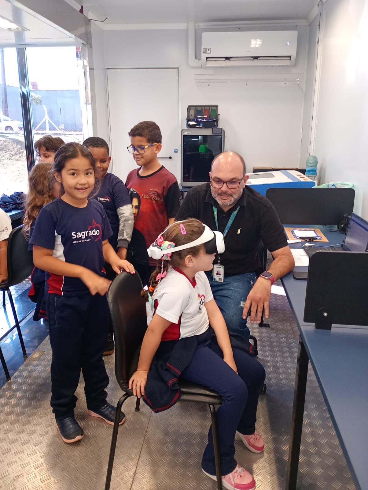 Durante a visita, os estudantes vivenciaram experiências incríveis com equipamentos modernos como impressora 3D, máquina CNC, inteligência artificial e óculos de realidade virtual.