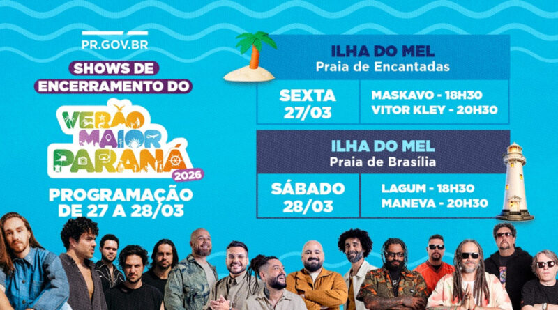 A Ilha do Mel, um dos principais cartões-postais do Litoral, será o palco de uma despedida nova do Verão Maior Paraná. Nos dias 27 e 28 de março, o festival promove quatro grandes shows nacionais: Vitor Kley, Maskavo, Lagum e Maneva.