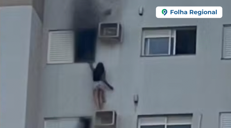 Imagens publicadas nas redes sociais mostram a mulher pendurada na parte externa do prédio, em cima de um suporte de ar-condicionado, fazendo o resgate, com a ajuda de vizinhos.