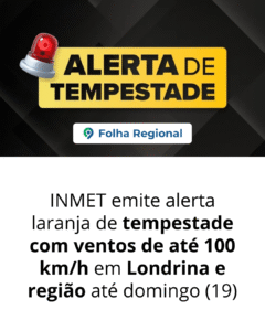 O Instituto Nacional de Meteorologia (INMET) emitiu um alerta laranja de perigo para tempestades em Londrina e diversas cidades do Norte Central do Paraná. O aviso é válido das 3h deste sábado (18) até as 3h de domingo (19), e prevê chuvas intensas, ventos de até 100 km/h e risco de queda de energia elétrica, alagamentos e danos em plantações.