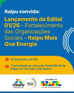 A Itaipu, por meio do programa Itaipu Mais que Energia e em parceria com a Caixa Econômica Federal, divulga nesta terça-feira (20) o edital Nº 01/26, que prevê apoio financeiro a projetos de organizações sociais dos 399 municípios do Paraná e de 35 cidades do Mato Grosso do Sul.
