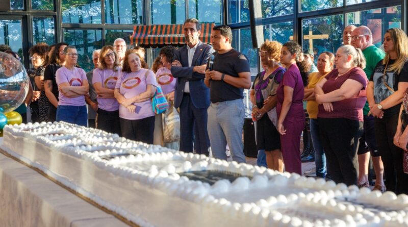 Em seguida, os participantes celebraram o aniversário com o “parabéns pra você” e um gigantesco bolo que trazia a inscrição da logo de cada comércio que compõe o Mercado Barrageiro.