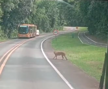 Uma onça-parda e seus filhotes foram vistos caminhando durante o dia em uma rodovia dentro do Parque Nacional do Iguaçu, onde estão localizadas as Cataratas do Iguaçu. O destino turístico fica em Foz do Iguaçu, no oeste do Paraná.