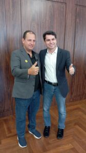 Prefeito de Porecatu, Agamemnon Paduan, ao lado do pré-candidato ao Senado, Alexandre Curi, durante encontro em Curitiba. Momento reforça diálogo, alinhamento político e compromisso com o desenvolvimento do Paraná. Foto: Paulo Silva