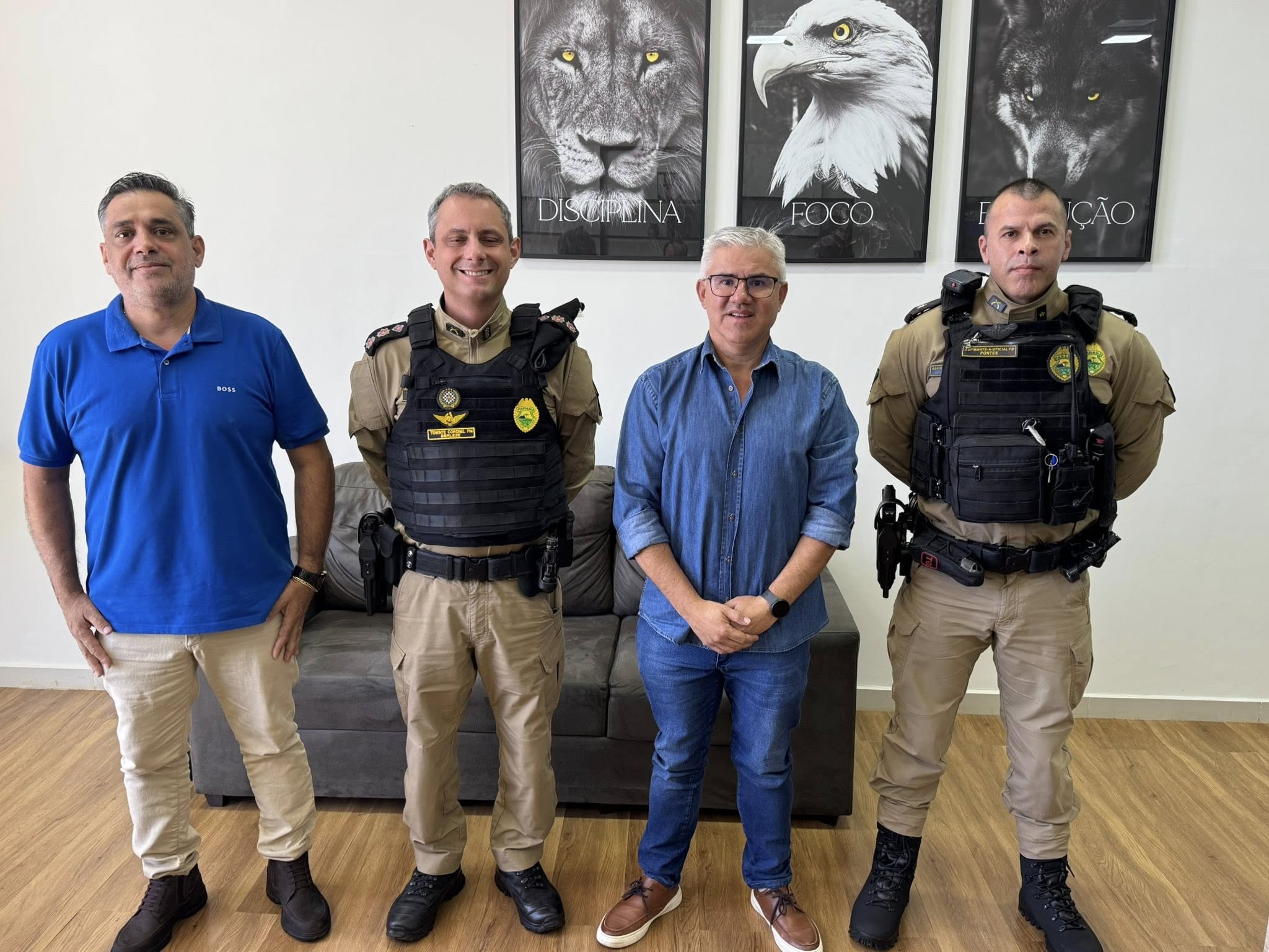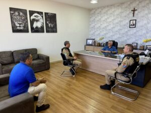 “Segurança em primeiro lugar! Hoje tive a satisfação de receber em meu gabinete o Comandante da 2ª Companhia, Aspirante Pontes, e o Comandante-Geral do 15º Batalhão da Polícia Militar, Tenente-Coronel Berleze, juntamente com o nosso Secretário de Administração, Celinho.
