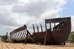 Embarcação de metal de cerca de 20 metros de comprimento, do século XIX.