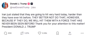 “O Irã acaba de declarar que vai atacar com muita força hoje, mais forte do que jamais atacou antes. É melhor que não façam isso, porque se fizerem, nós os atingiremos com uma força nunca vista antes!” , disse Trump.