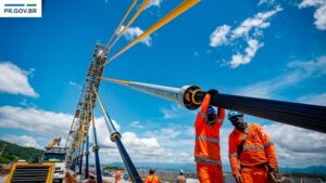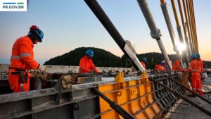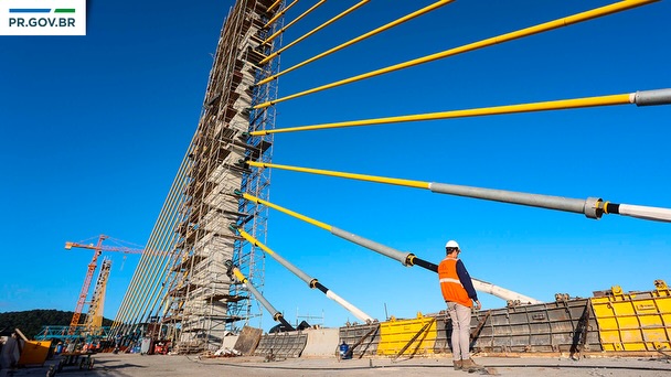 A construção da Ponte de Guaratuba alcançou um dos marcos mais importantes desde o início das obras: o trecho estaiado chegou aos 320 metros totais executados com o fechamento do vão central tendo sido realizado na semana passada. O avanço coloca a obra na reta final de uma das etapas mais complexas da engenharia sobre a Baía de Guaratuba.